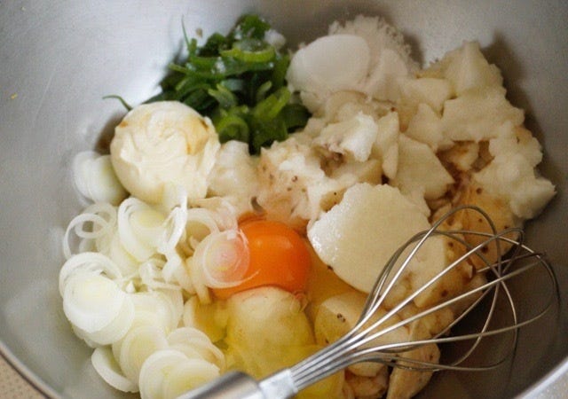 ① 長いもは大きめの乱切りにし、袋に入れて麺棒などで少しかたまりが残る程度にたたく。長ねぎは小口切りにする。