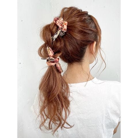 少し高めの位置で作ったポニーテールにスカーフ付きのシュシュを結んで、スカーフと一緒に髪を編み込んでいくことで髪だけでは作れない表情を出した、まとめ髪のヘアアレンジです。