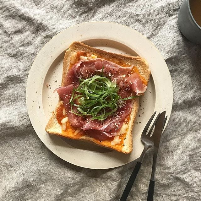 九条ねぎと生ハムをのせたピザトースト。お店で食べた美味しいピザを参考に考案したレシピなので間違いない組み合わせです。