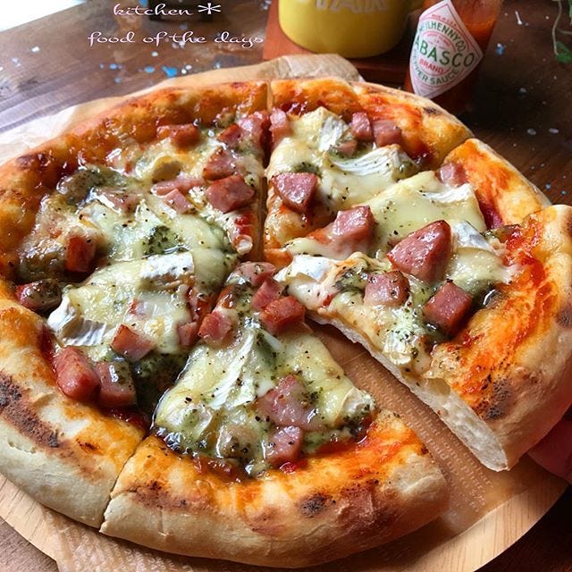 材料にカマンベール、ハムをのせたボリュームも満点の絶品ピザレシピです。