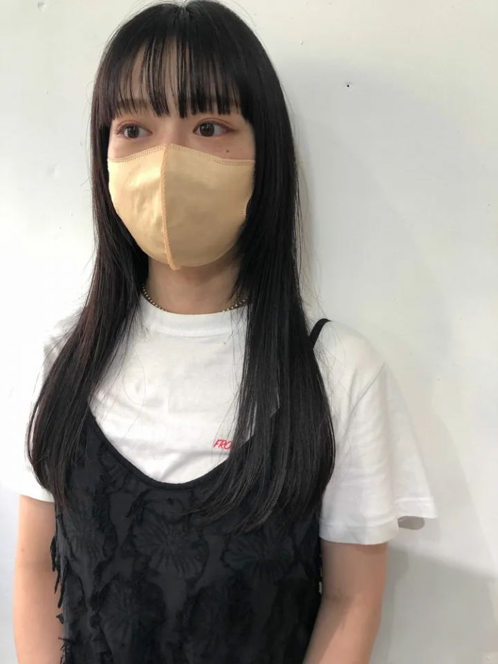 黒髪や暗髪の切りっぱなしロングは大人っぽく見えますが、オン眉を組み合わせることで可愛らしい印象のおしゃれなロングヘアになります。