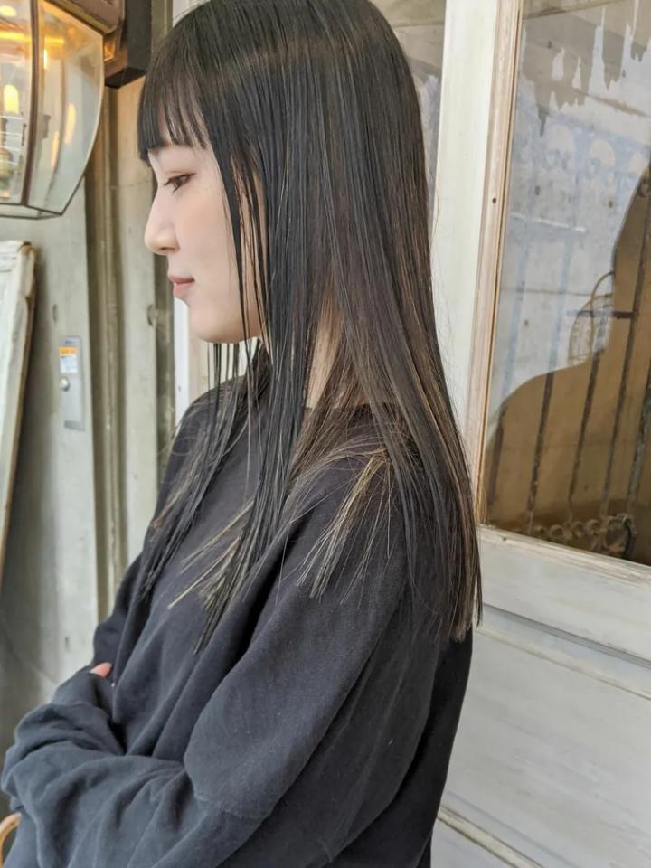 黒髪の切りっぱなしロングは、インナーにハイライトを入れることで野暮ったく見えない大人っぽい、おしゃれなスタイルに仕上がります。