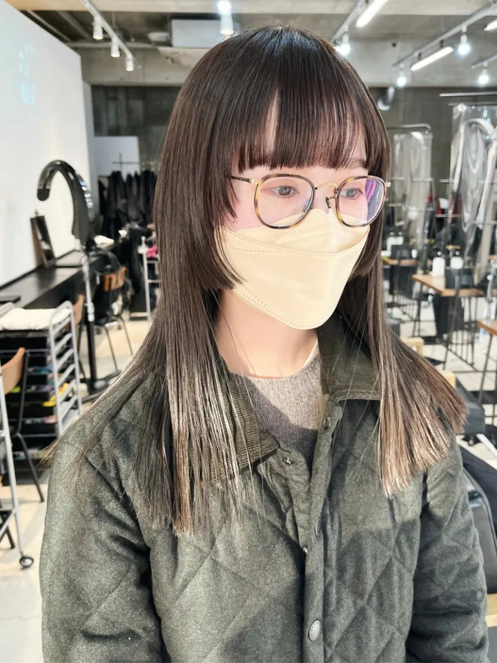 こちらはアッシュブラウンで全体的に柔らかな印象があるので重めのプツっとカットでも軽やかさがプラスされています。