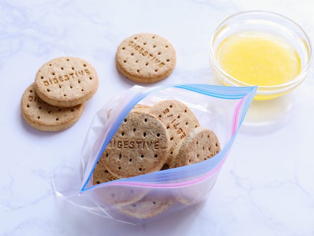 ① 全粒粉クッキーは、厚手のビニール袋に入れ、麺棒などを使って粉状になるまで砕く。(甘さ控えのも全粒粉クッキーを使っています。バタークッキーやビスケットなどを使う場合は、レモンカスタードの砂糖の量を少し減らしてください。)