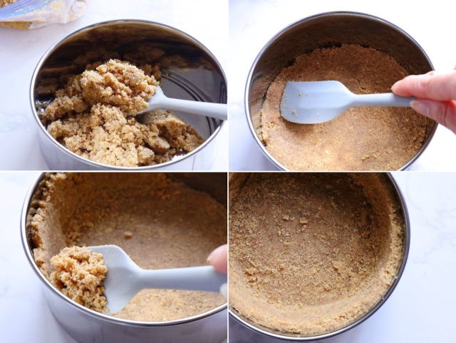 ④ 底が取れるケーキ用に型に、ゴムベラなどを使って押し付けるように土台を作る。立ち上がりを4cmほど作る。