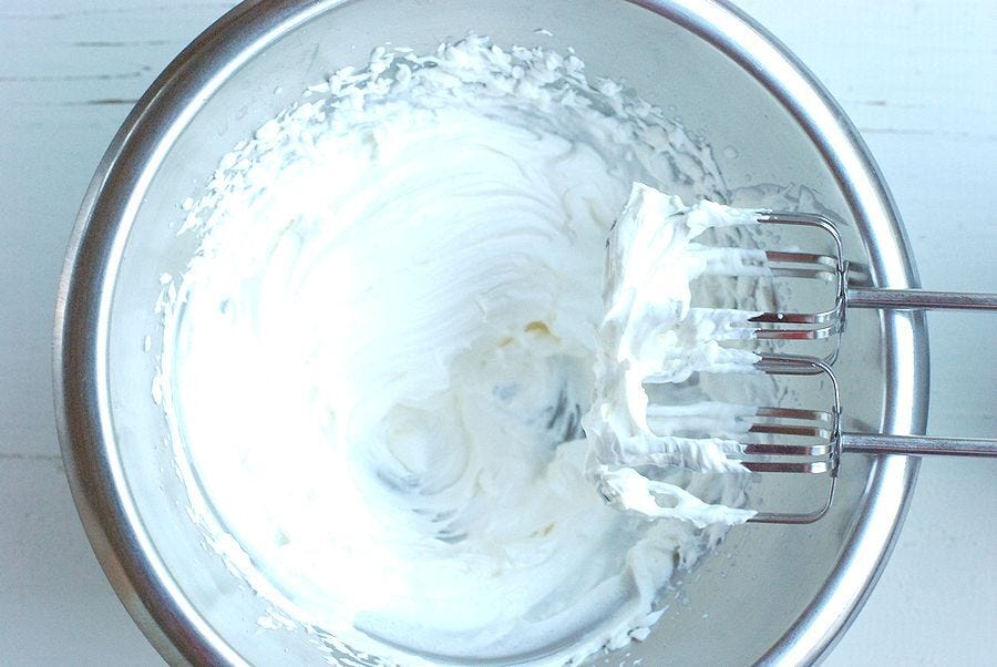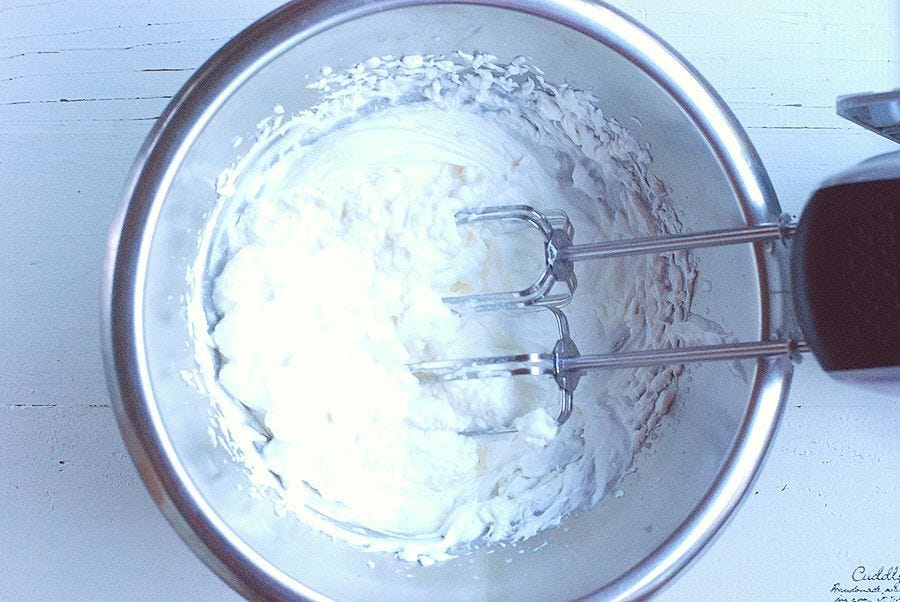 ① 生クリームとグラニュー糖をボウルに入れ底を氷水で冷やしながら角がたつまで泡立てる。