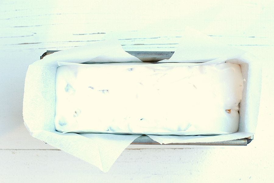 ④ オーブンシートを敷いたパウンド型に生地を流し入れ、冷凍庫で一晩かけて冷やし固める。