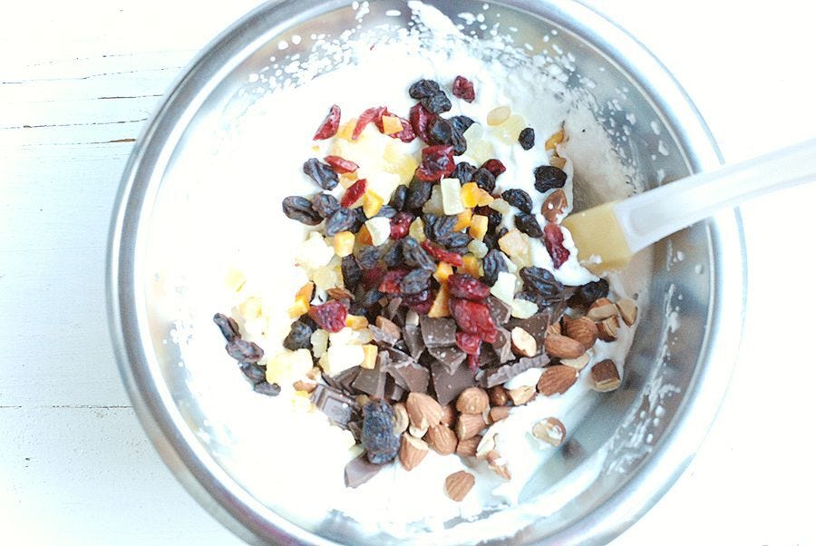 ③ ドライフルーツとナッツ、チョコレートを加え混ぜ合わせる。