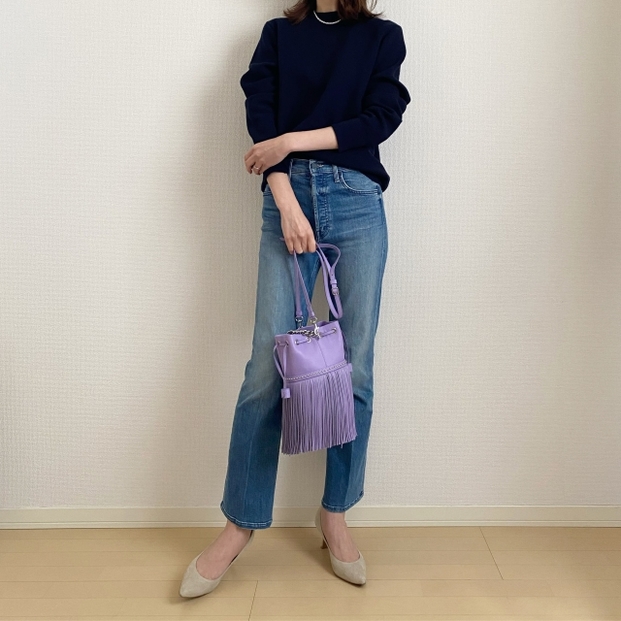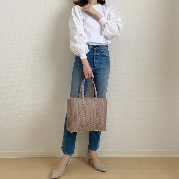 白ブラウスにデニムを合わせた王道だけれど春らしいスタイル。少し甘めのブラウスを着用するときは、ヒールなど大人っぽく見える小物をプラスすることで全体の印象がグッと大人っぽく仕上がるのでおすすめです。