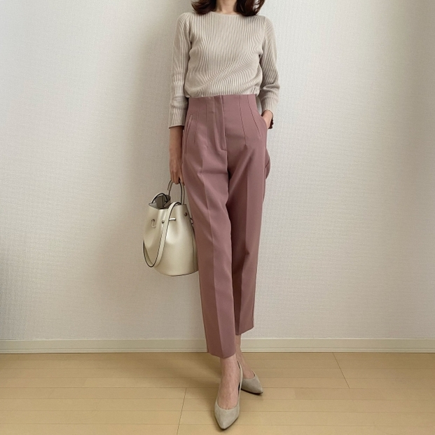パンツ以外をアイボリーやベージュでまとめると、カラーパンツがコーデの主役になり印象的で華やかな印象に。
