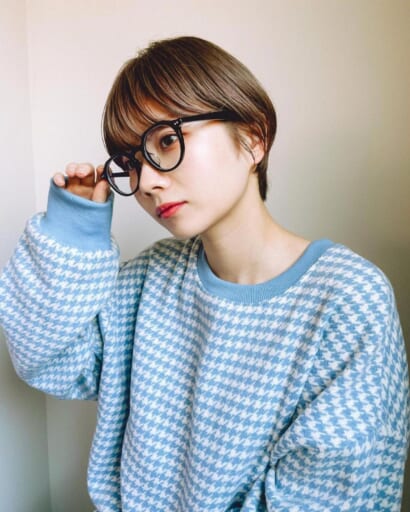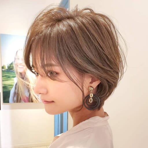 シルエットをコンパクトに見せることができる“長め前髪×丸みシルエット”のマッシュショートは小顔効果大。それでいてほんのりクールな雰囲気を醸せます。顔の大きさを相対的に小さく見せるために、輪郭に合わせてトップのボリューム感を調整することがポイント。「輪郭の弱点をカバーしている」という印象を与えないように、あくまでナチュラルな仕上げにこだわりましょう。