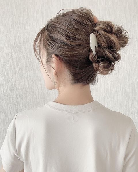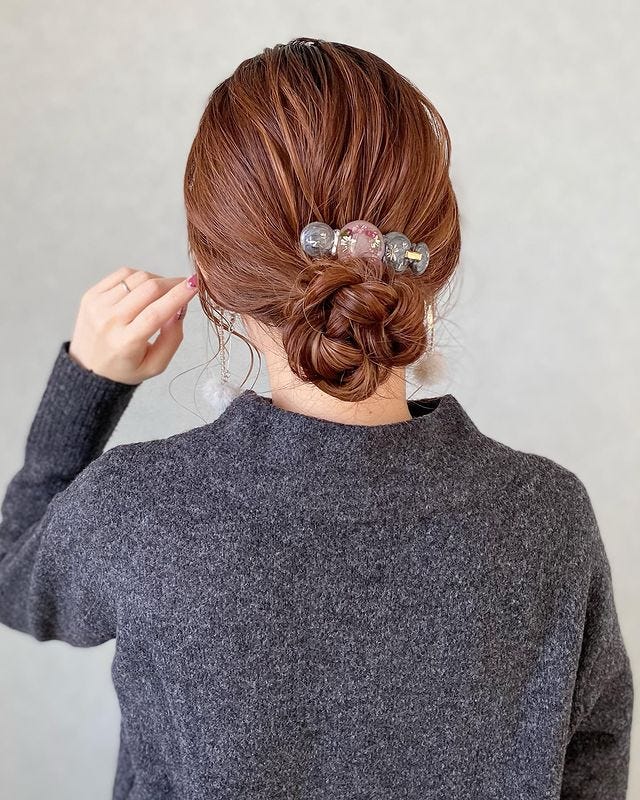 ハチ上でお団子にした髪の毛の毛先を前髪とかぶるようにお団子の近くでバレッタで留めれば、頭皮の薄い部分もうまく隠れて簡単にボリューミーになりますよ。
