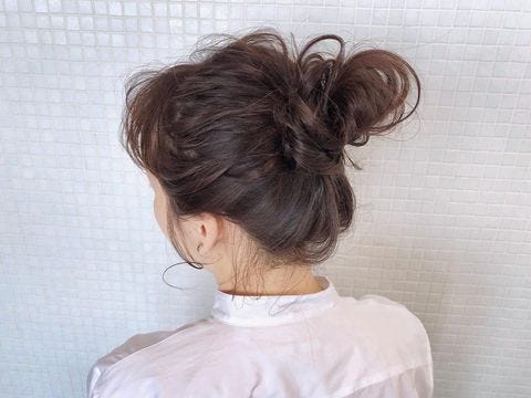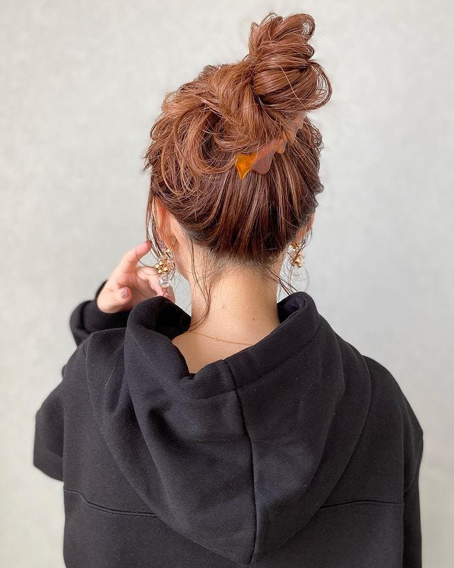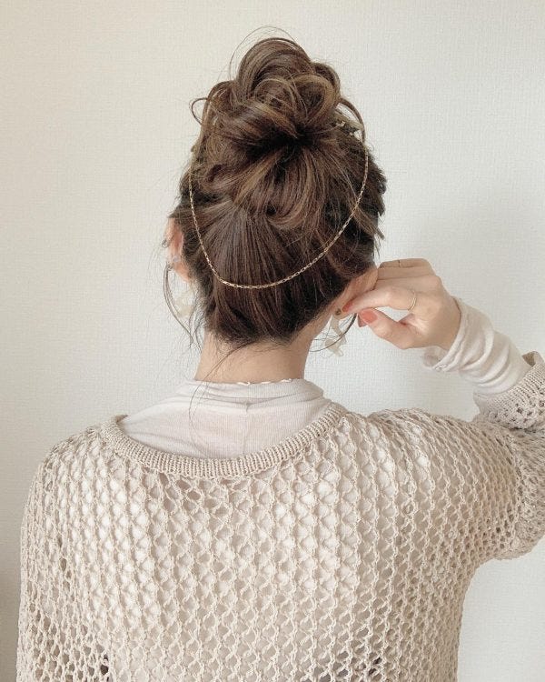 高め位置に結んだお団子をラフに崩して、ゆるい感じにスタイリング。長めの髪の毛なら簡単にできるのでロングの人にぴったりです。