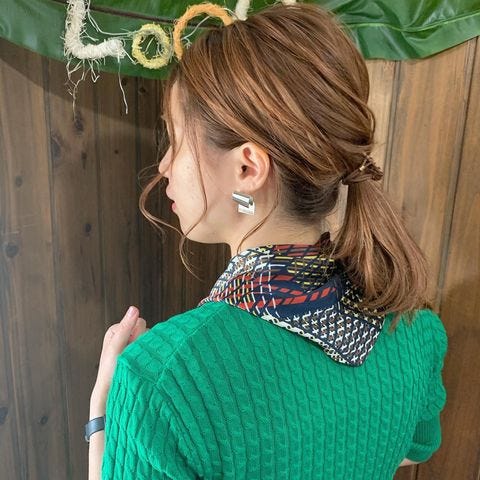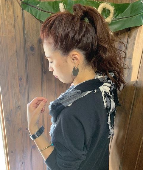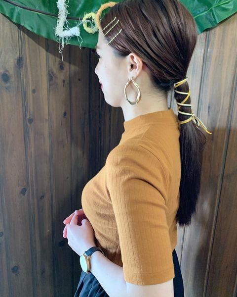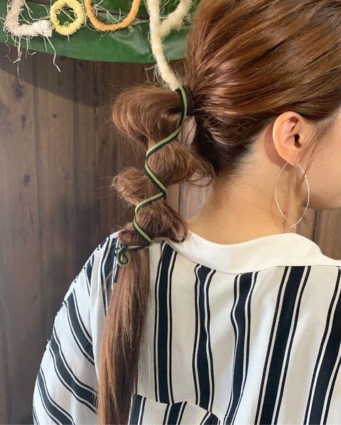 もう少しカジュアルさがある前髪なしの紐ポニーテールにしたい場合は紐を髪に巻きつけた後に、ほぐしてあげるのがおすすめですよ、紐の間から髪を少しずつ引っ張ってあげることで、ラフさが増して大人カジュアルな仕上がりになります。