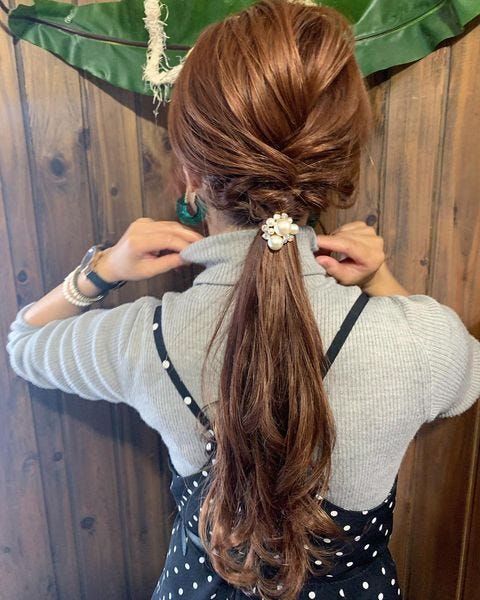 巻かなくても、おしゃれに仕上がる前髪なしポニーテールのため時間がないときや巻くのが苦手な方も挑戦しやすいですよ。