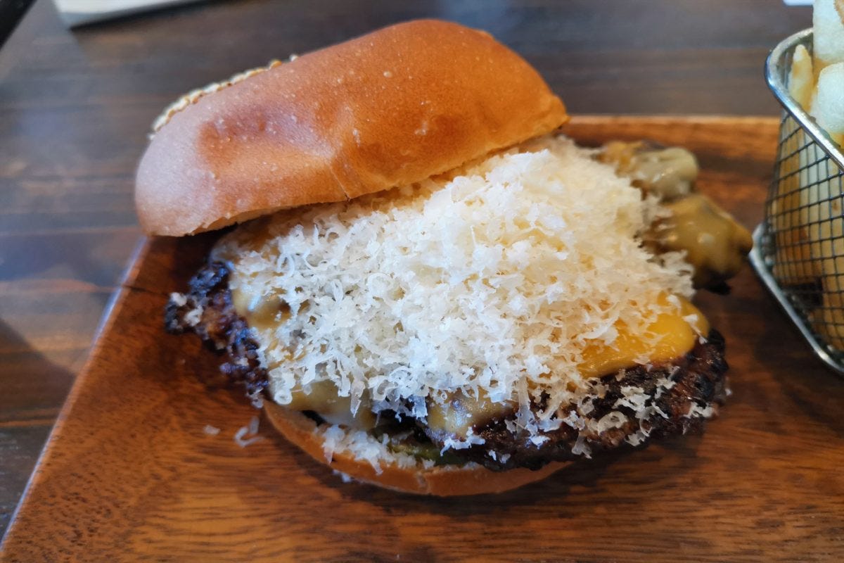 限定のプレミアムチーズバーガーはパティが大きく、削ったパルミジャーノチーズがさらに濃厚さを加え絶品。