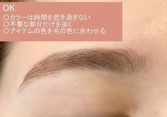理由は簡単です!脱色剤とは、毛の色素を抜くためのものなので、どうしても日本人の毛質だと黄色みや赤みが出やすいのです。そして、それを本数の多い濃い眉に使うと色がまだらに抜けてしまったり、色を均一にしようとすると放置時間が長くなるので、黄色みがとても強く出てしまったりして、あまり綺麗に仕上がらないことが多くあるんです。
