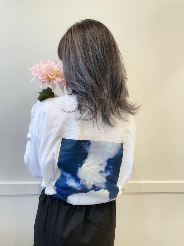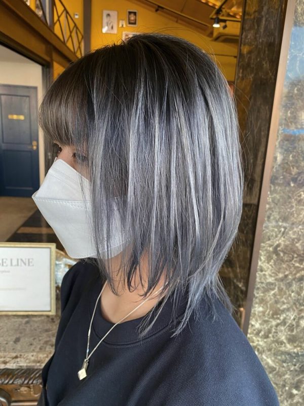 ブリーチを入れてグレーアッシュの色合いが引き立つようにすると、より立体感が生まれます。