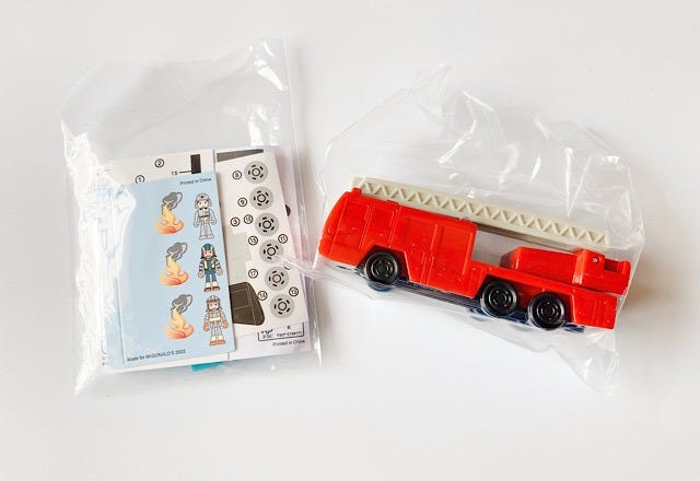 マクドナルド公式HPから引用すると、「消火訓練施設&日野はしご付消防車(モリタ・スーパージャイロラダー)」だそうです。