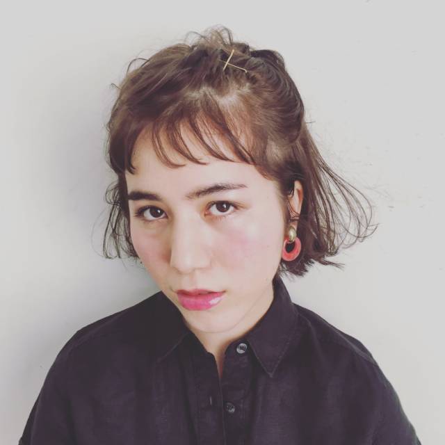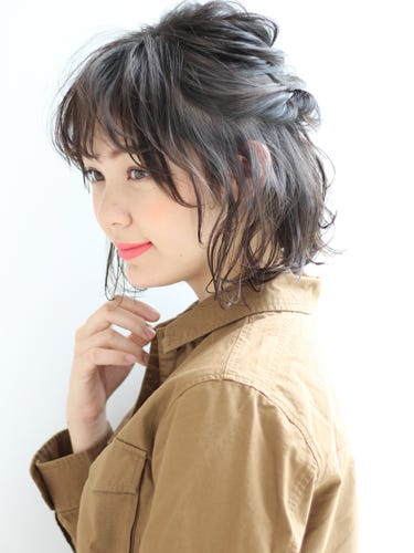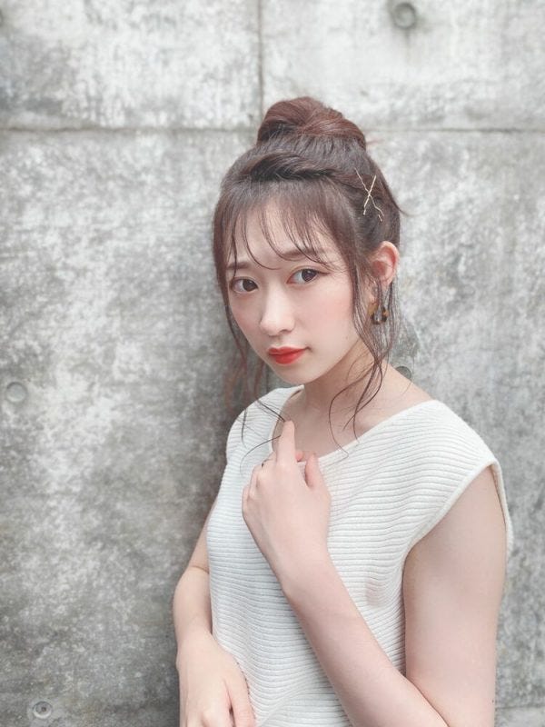 重い前髪のスタイルとアップスタイルのギャップを楽しみましょう。
