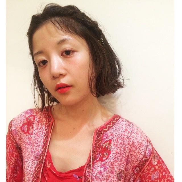 こちらも前出同様、重い前髪をポンパ風ツイストで減らして、シースルーバングにしているアレンジ。