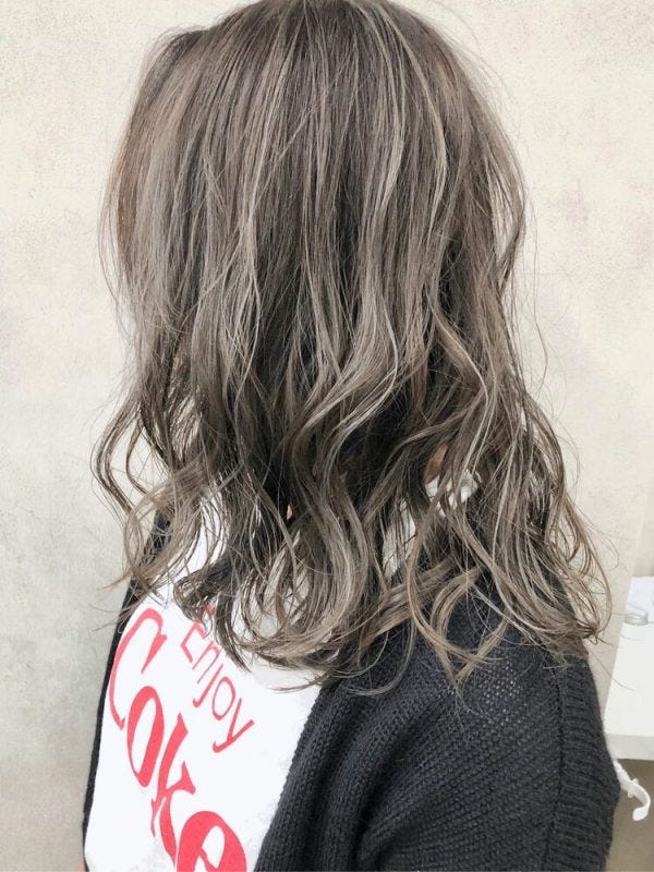 グレーアッシュの色合いでも十分垢抜け感がありますが、ランダムハイライトを入れることでより透明感を引き立てるので、日本人離れした外国人風のおしゃれなセミロングヘアーを楽しむことができますよ。