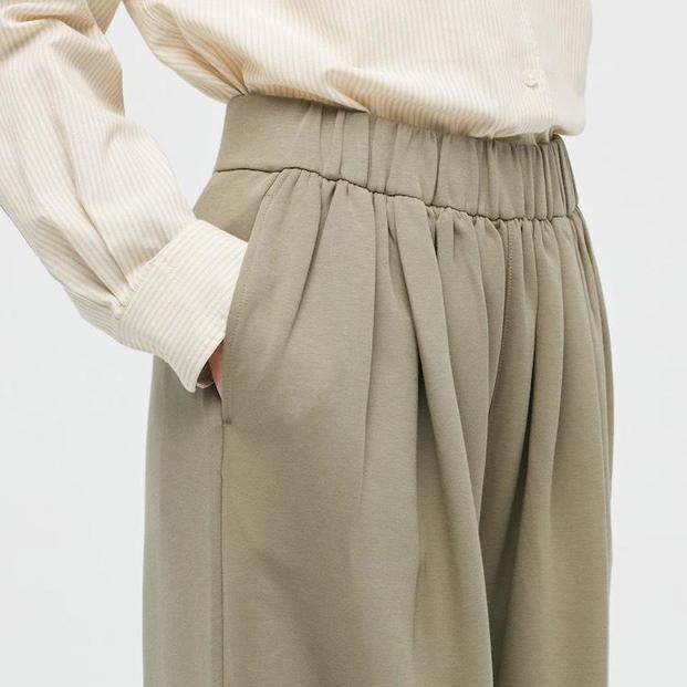 たっぷり入ったギャザーから流れるシルエットが美しく、快適な履き心地です。ウエストはゴムとひもで、ゆったりラクに履けます。