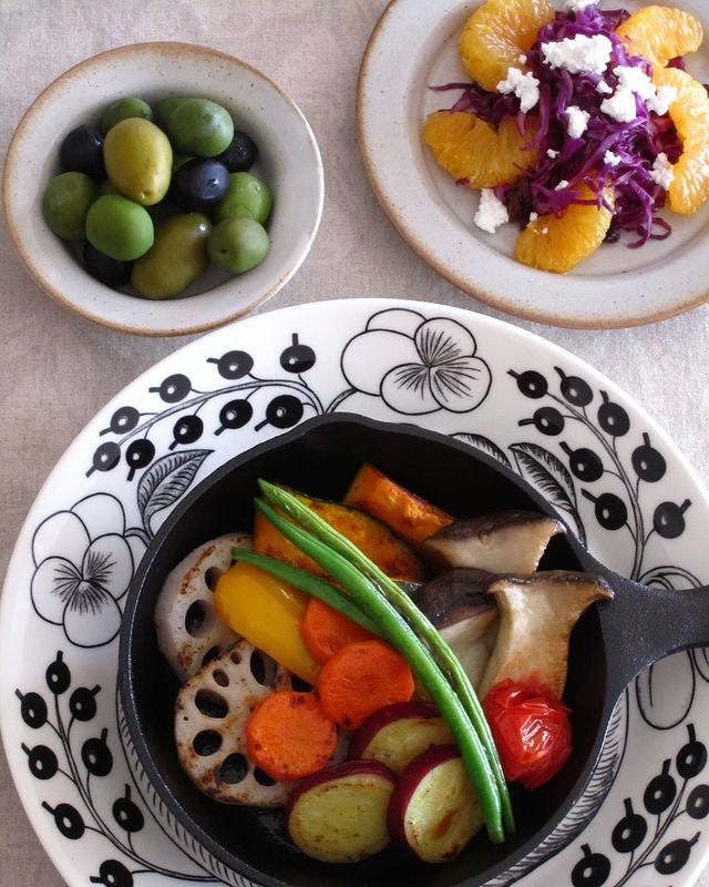 かぼちゃ、さつまいも、れんこん、エリンギ、トマト、インゲンなど野菜がたっぷり入ったホットサラダは、スキレットやフライパンでしっかり焼くだけなのでとても簡単。