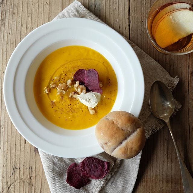 お芋チップス添えかぼちゃポタージュレシピ
