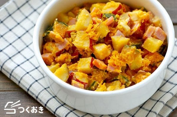 さつまいもとかぼちゃにハム、チーズを合わせたダイスサラダは、お弁当に入れても美味しい人気の副菜レシピです。