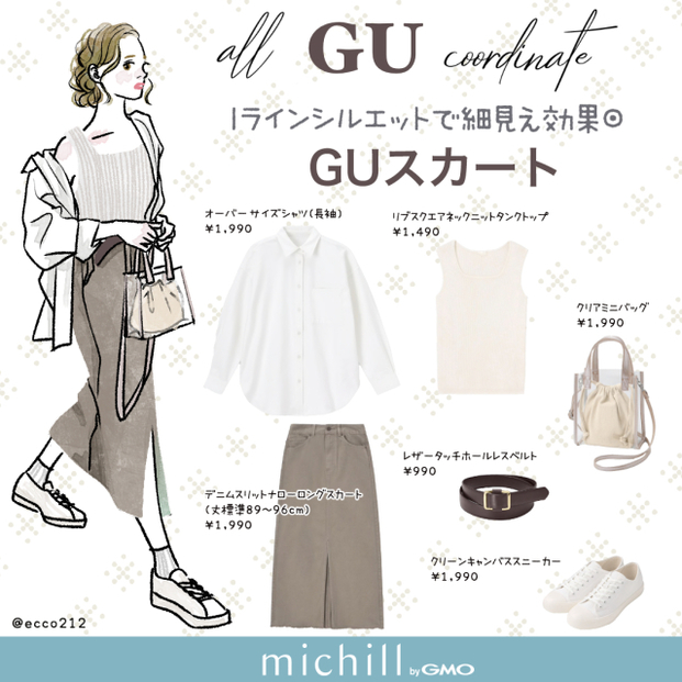 GU「デニムスリットナローミディスカート」は縦ラインを強調するステッチワークによってバツグンの細見え効果を発揮!深めに入ったスリットによって足さばきがよくアクティブに動けます。今回はオーバーサイズシャツを羽織ったこなれ感たっぷりのフェミニンカジュアルコーデを完成させました。早速詳細をチェックしてみて♪