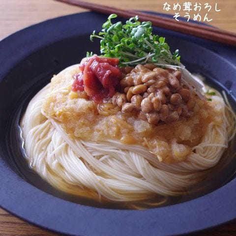 具沢山のそうめんをさっぱりと食べたいときにおすすめなのが、こちらのレシピ。なめたけや大根おろし、納豆や梅などヘルシーな材料で作る具沢山のそうめんです。
