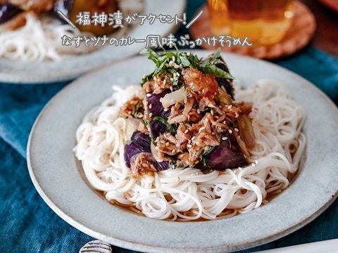 薬味たっぷりナスとツナのカレー風味ぶっかけそうめん