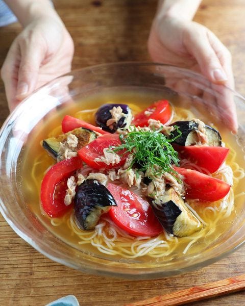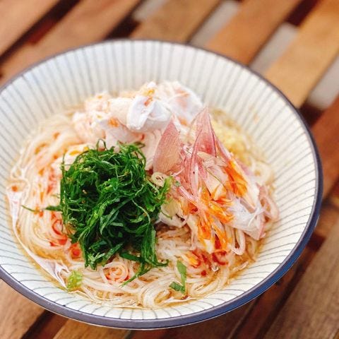 ナスやトマトの食感とツナの旨味が上手くマッチした食べ応えのある野菜たっぷりの具沢山そうめんがいただけます。