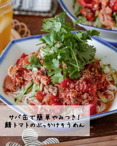 こちらはそんなさば缶とトマト缶を合わせた一品で保存できる缶詰めで手軽に具沢山のそうめんが、いただけるレシピです。