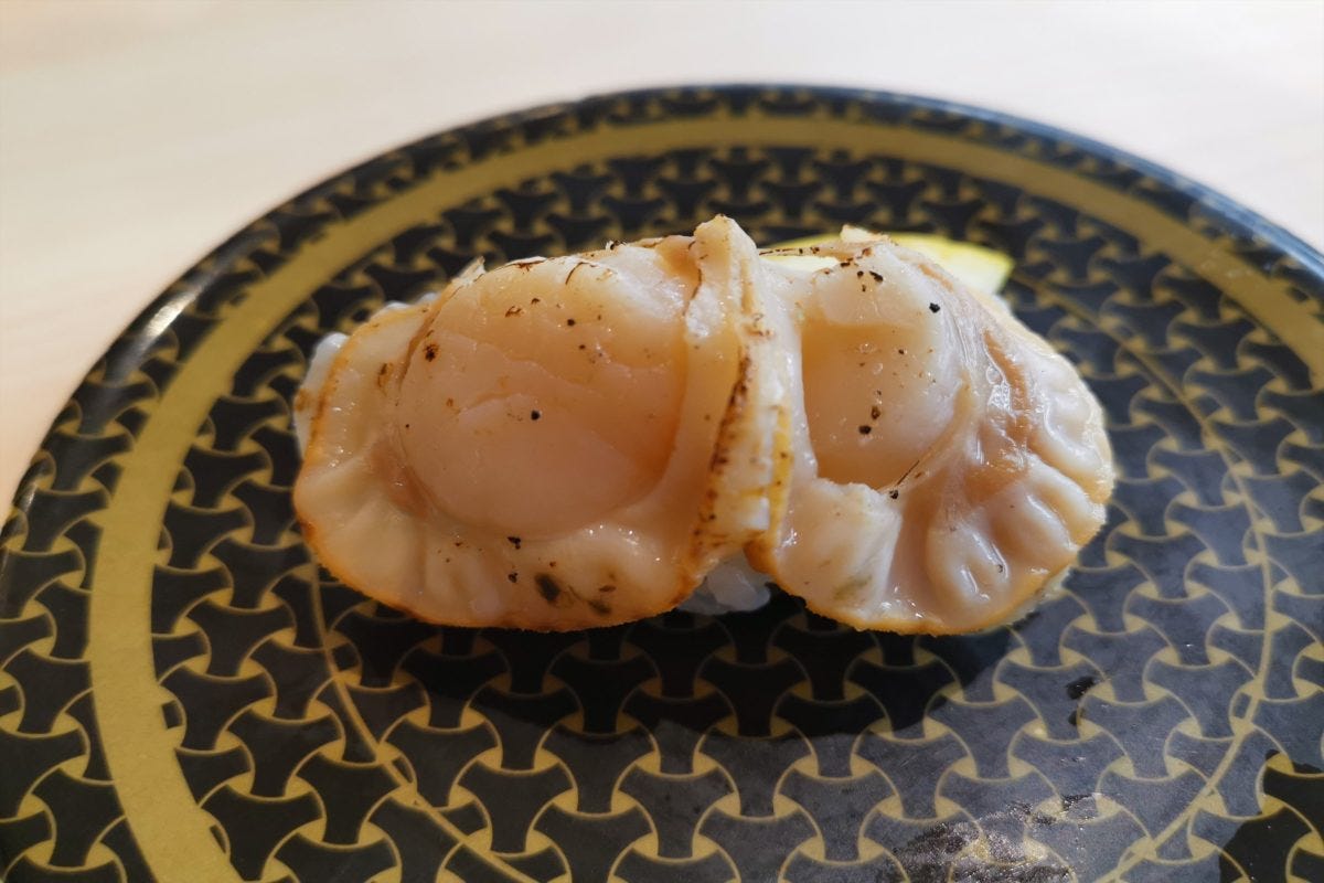 4皿目の青森県産蒸しほたては、100円とは思えない肉厚さで旨味も十分。デカネタ度100パーセントである。