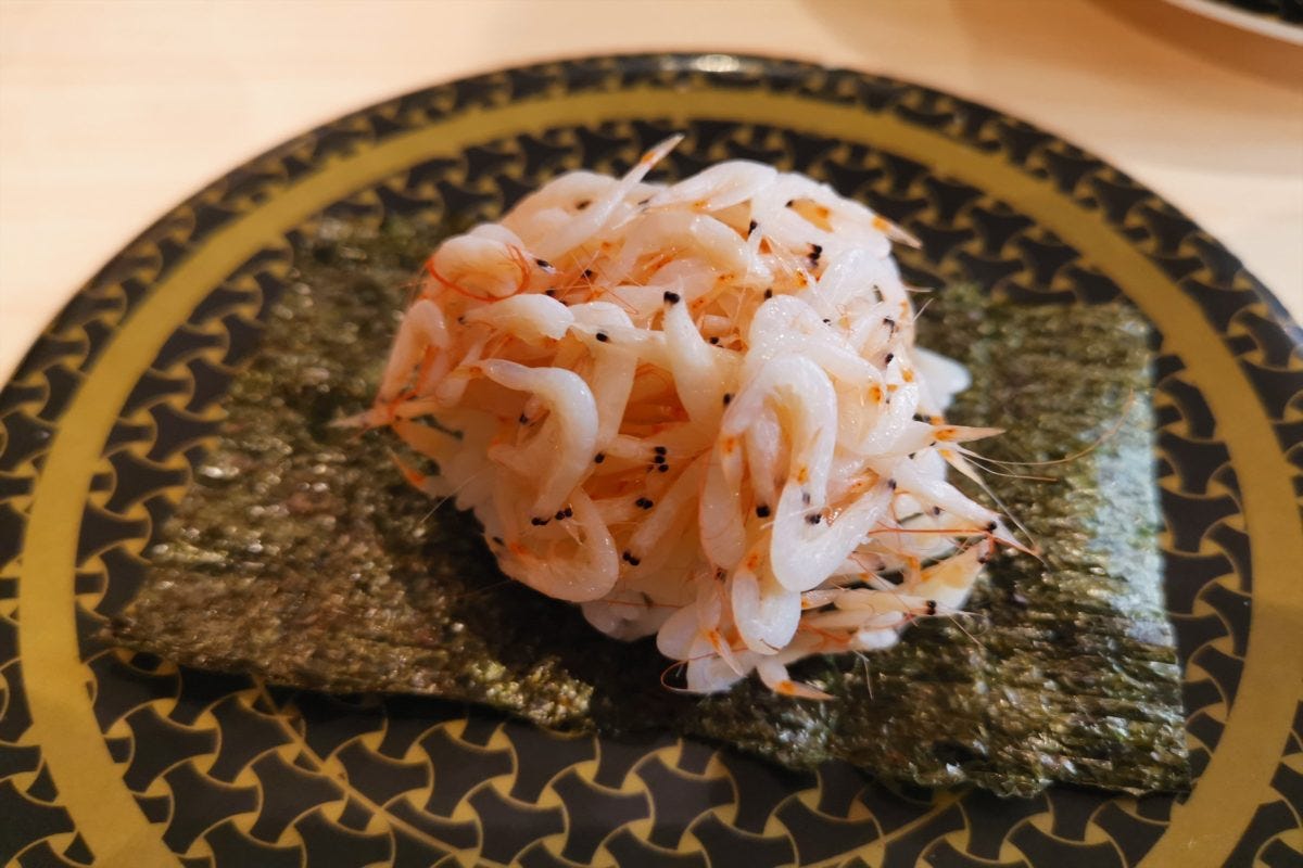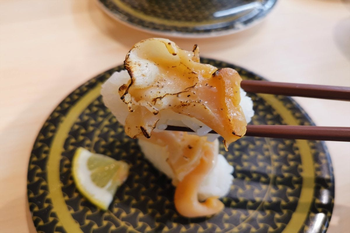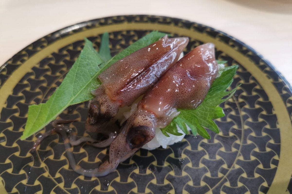 しかし、ここまで大きいネタ、本当に100円から提供できるのだろうか? 実際に食べて確認することにした。まず1つめは、富山県産の大ぶりほたるいか。確かに酢飯を覆うぐらいデカいほたるいかで、食べ応えバツグン。文句ナシのデカネタだ。