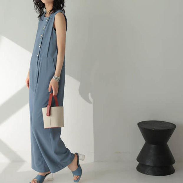 さらりとした落ち感のある生地とシンプルなストレートシルエットの共演で細見えを叶えてくれるオールインワン。肩からウエストにかけてあしらわれたダーツデザイン、そしてウエストの切り替えから延びるセンターラインがスタイルアップに繋がります。ボタンディティールがアクセントになったデザインで全部留めてもよし、少し開けてもサマになる1着。やや凹凸のあるさらりとした素材が暑い夏にぴったりで、お出掛けを快適なものにしてくれますよ。