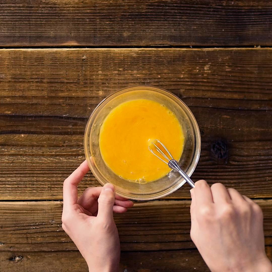 ボウルに卵を溶きほぐし、砂糖、塩を入れて混ぜ合わせます。