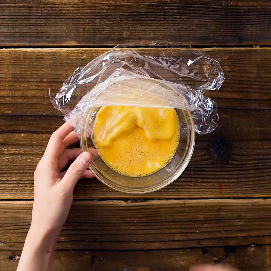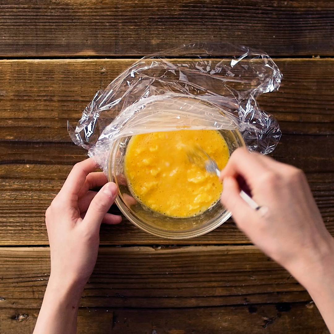 ラップをかけ、レンジ600Wで1分加熱します。
