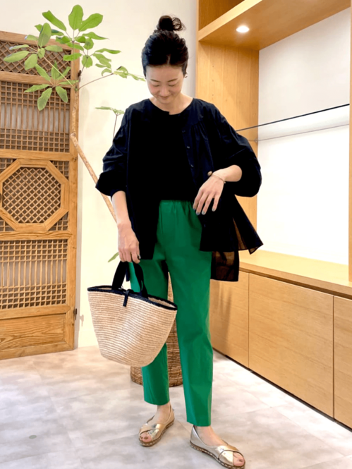 そして、下半身は細めのシルエットやカラーパンツを合わせるとすっきりまとまり、カバーもしながらおしゃれ度も高いコーディネートに仕上がります。