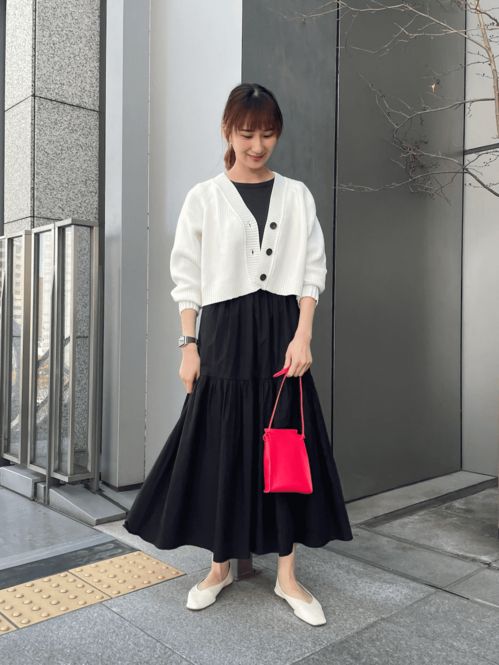 そして、フレアタイプのロングスカートやワンピースなど、ラインの出にくいボトムスを選ぶとバランスがよくなります。