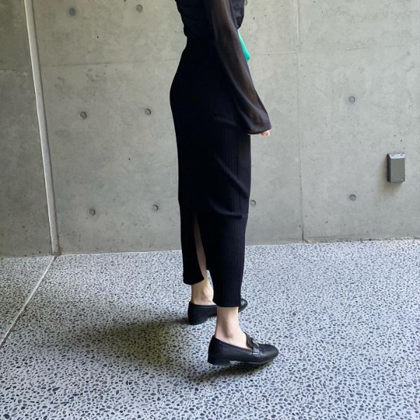 ストレート型のリブニットスカートでシンプルなデザインですが、実はマメクロコラボらしい美シルエットに見えるポイントが隠れているんですよ。