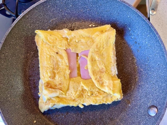 ③ 2枚の食パンの上に、カットしたチーズ・ハムをそれぞれ乗せて加熱し、食パンの外にはみ出している卵を食パンの上に折り込み、さらに食パンの切れ目をパタンと折り込みます。