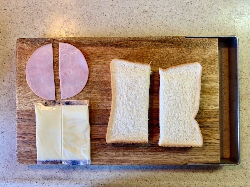 ① 食パン・ハム・スライスチーズは、それぞれ半分にカットしておきます。
