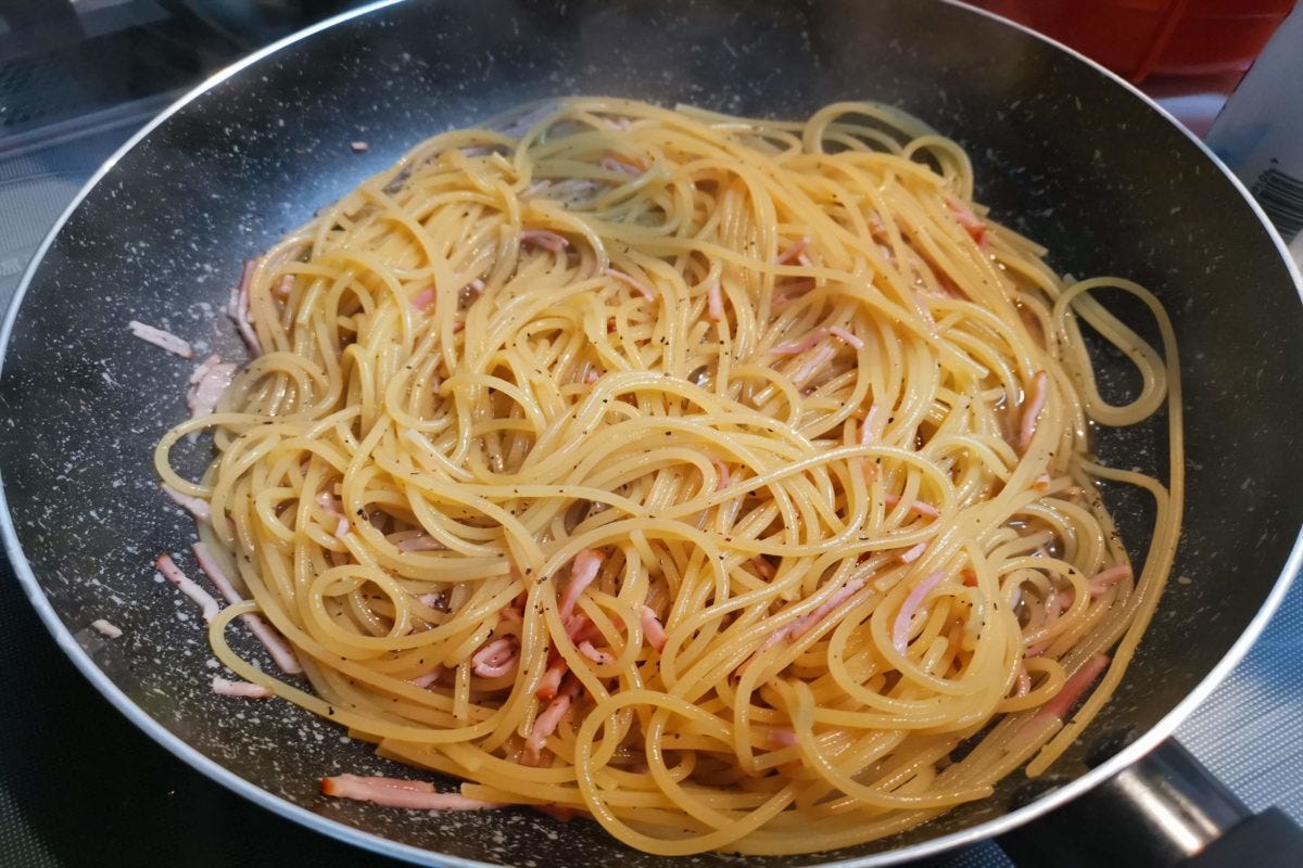 あとはゆであがったパスタをフライパンに入れ、混ぜるだけで上質なチーズソースのパスタができる。今回はベーコンがあまっていたので、ベーコンと黒コショウ、ペコリーノ・ロマーノのスパゲッティとして仕上げた。
