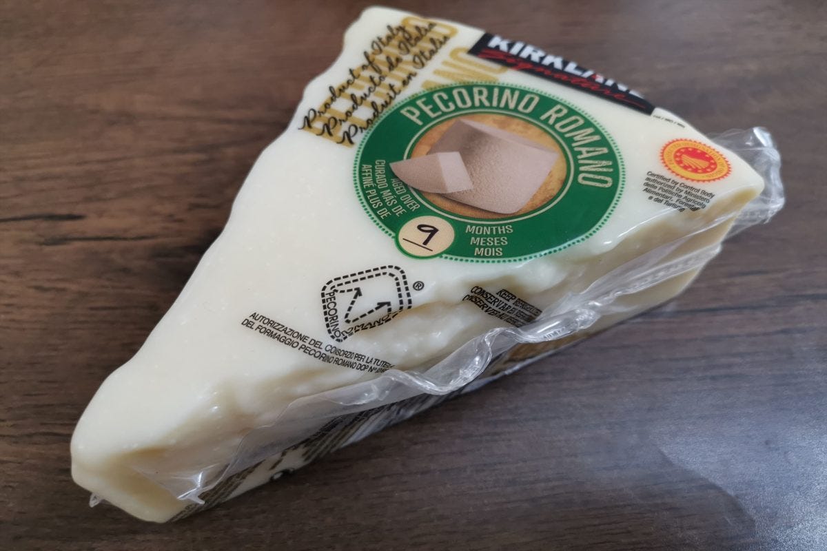 ペコリーノ・ロマーノは羊の乳が原料のチーズで、コストコで販売している物は熟成期間が長いタイプで、ある程度長持ちする。そのままスライスしてパンと一緒に食べてもいいし、パスタのソースにすることもできる。