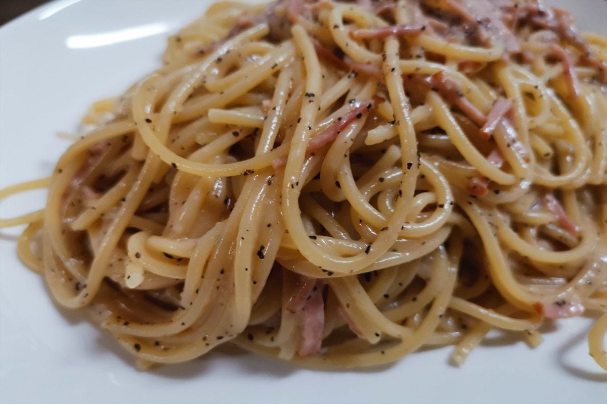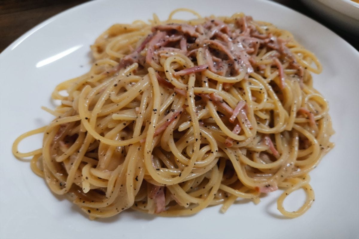 ペコリーノロマーノはややクセがあるチーズなのだが、黒コショウとの相性がバツグン。ベーコンを抜けばイタリア風のパスタ「カチョエペペ」である。