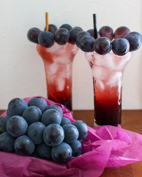 オレンジやレモンをコップのふちに差し込むのは一般的ですが、ブドウやマスカットなど丸いフルーツをコップのふちに差し込むアイデアも素敵ですね。