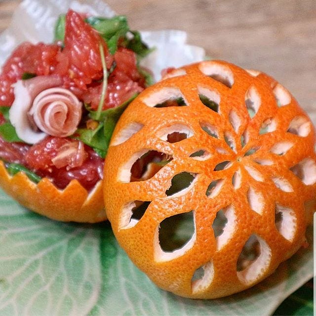 カーヴィングという技術なのですが、とておおしゃれで食卓が華やかになる盛り付けアイデアですね。